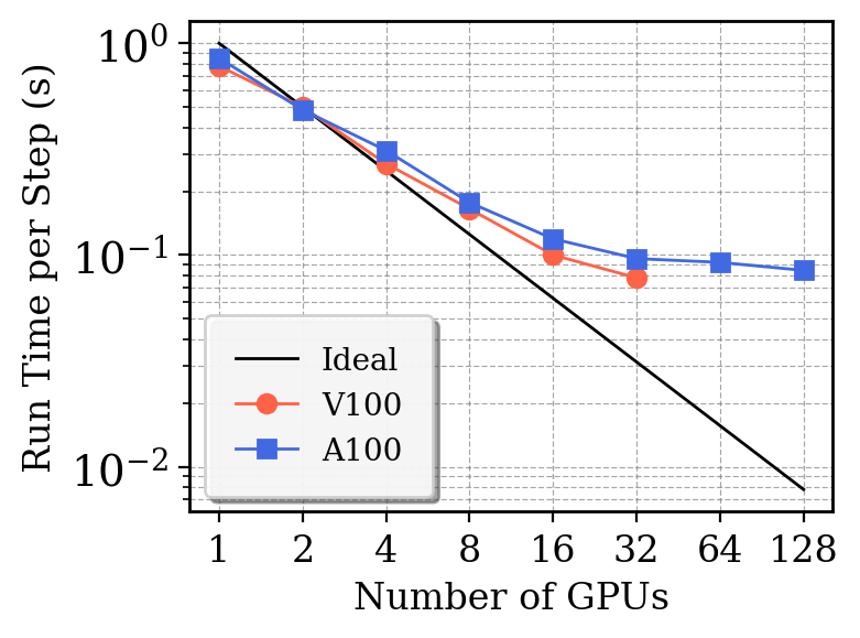Weak scaling tests of our 3D model to assess how performance changes as both the problem size and the number of GPUs increase proportionally. A100s and V100s were on different super-computers.